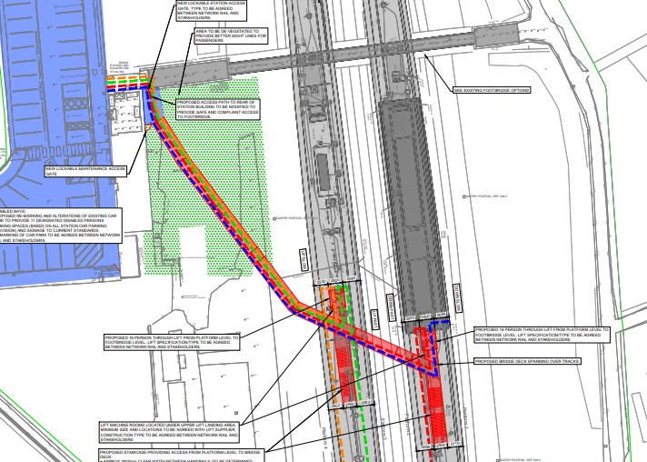 To provide a step-free route to both platforms a new bridge is to be built at the station. The current bridge will remain. This new bridge will include lifts to both platforms. The draft design included stairs from both platforms so that this new bridge could be accessed via the lifts or the stairs. Over the Summer, Network Rail told us that due to budget constraints they were removing the stairs from the scope of the design. We were told this would save them around £500,000.