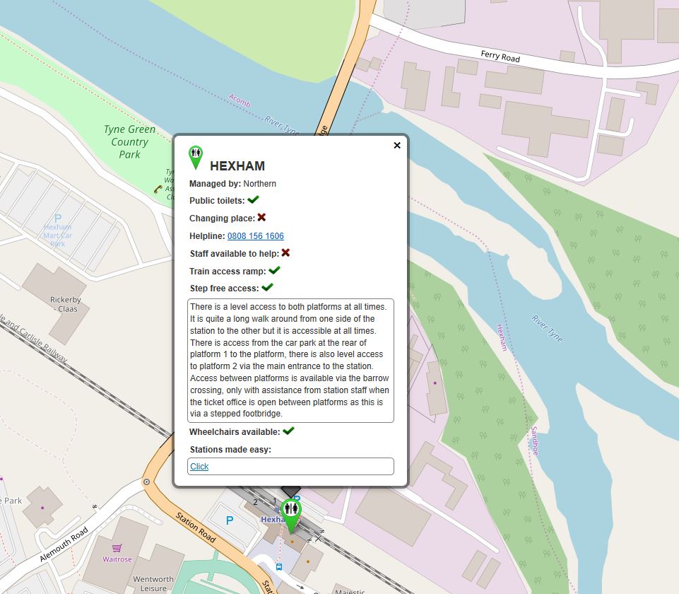 While GTR have at least been proactive in changing some aspects of their station descriptions the same can’t be said for Northern, who seem resolute in refusing to change any ‘fully accessible’ green pin descriptions at their stations. Below are their ‘Access Map’ descriptions of Hexham, Riding Mill and Stocksfield stations, all located on the Tyne Valley Line.