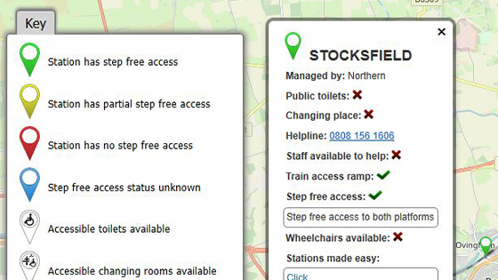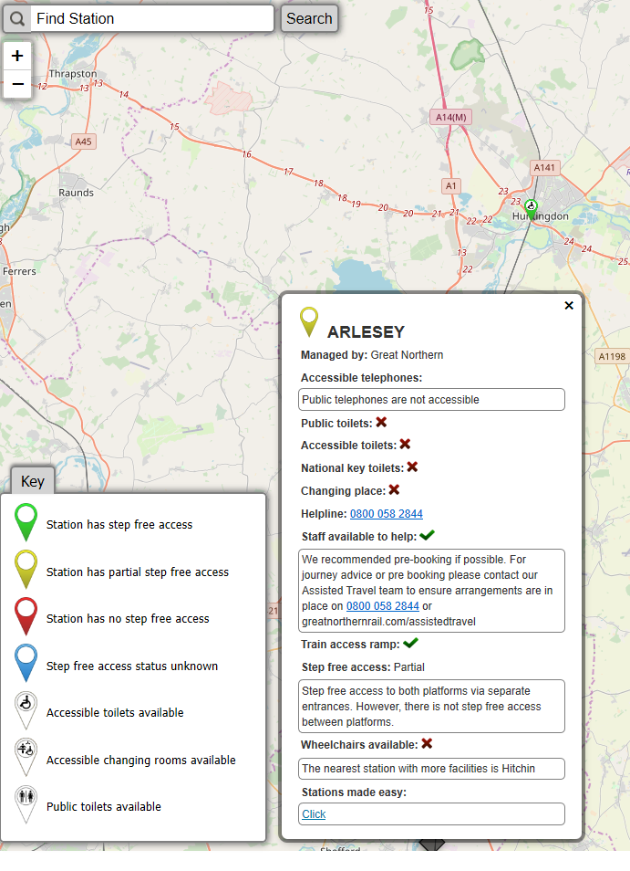 When this issue was raised with Govia Thameslink Railway (GTR) in relation to a number of stations on their Great Northern route, they quickly changed their description to indicate partial access, indicated by a yellow pin, one of the stations being Arlesey in Bedfordshire below.