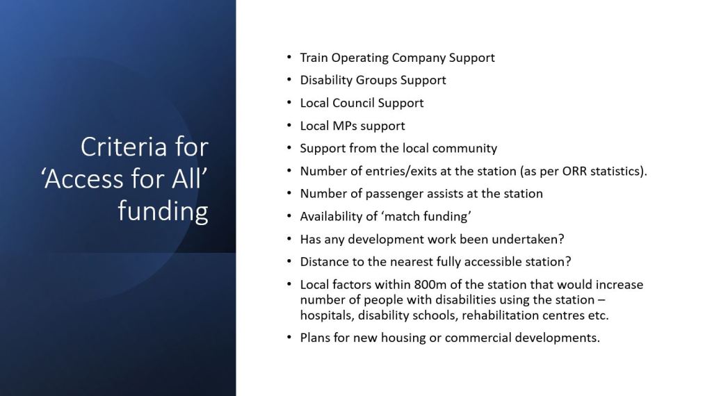 Below are the relevant criteria set out by the Department for Transport, which the Train Operating Companies (TOCs) complete for each station and then rank accordingly. This information is then sent back to the Department for Transport who are the decision makers in which stations are allocated funding. This is an opaque process and neither the TOCs nor the Department for Transport are willing to, publicly at least, release the ranking order or give details on the content of the bids.