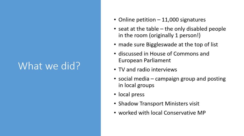 I am just the spokesperson for BRAN, and we have wheelchair users and visually impaired people on our team who provide ‘lived experience’ and expertise in accessibility issues. Until we became involved there was no-one sitting at the table who would actually directly benefit from the improvements that were being proposed.