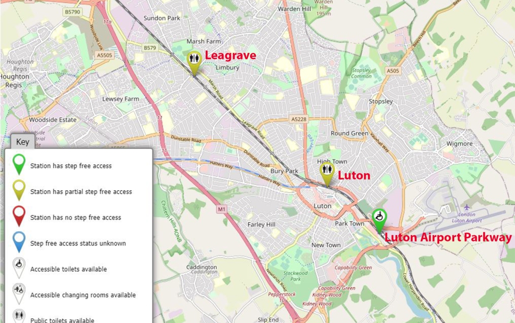 Leagrave does have an accessible toilet, but it is located on a platform at which no trains stop. This really is just ticking a box, without any thought to the actual needs of wheelchair users and those with reduced mobility.