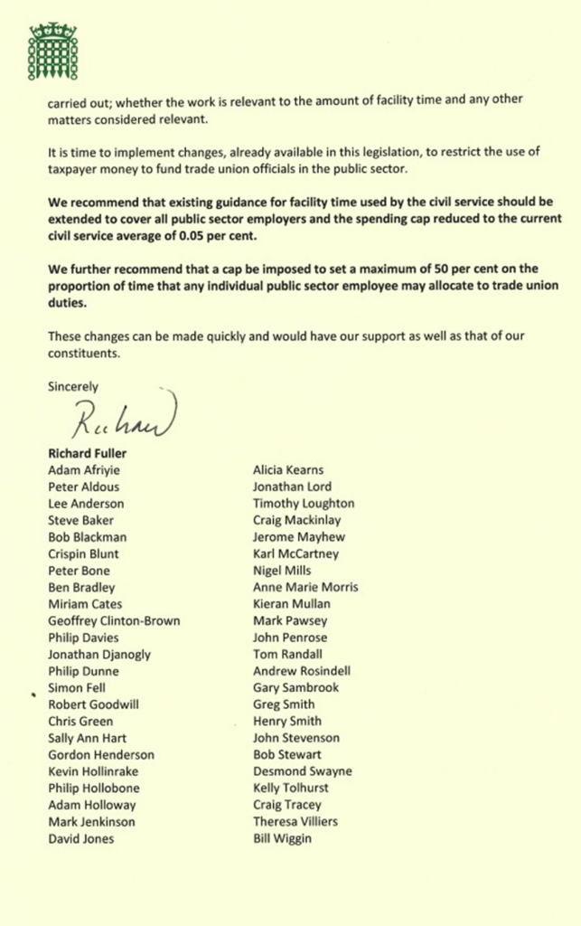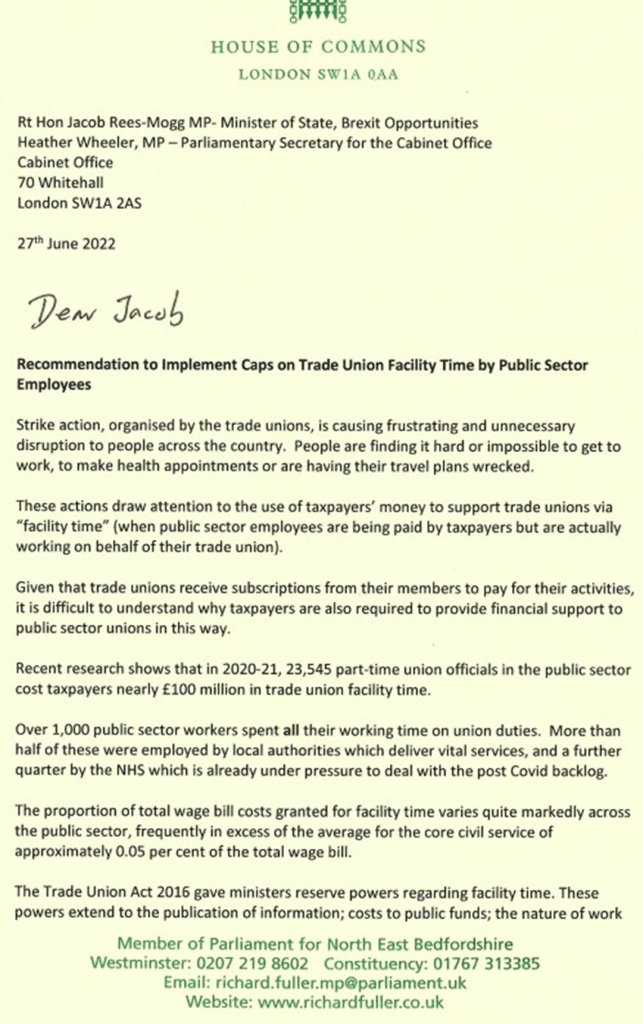 My MP Richard Fuller is the latest of a long line to join in the union bashing. On the 27th of June, he wrote to the Rt Hon Jacob Rees-Mogg, Minister of State, Brexit Opportunities, recommending a cap on trade union representatives’ facility time within the public sector. The letter is in full below.