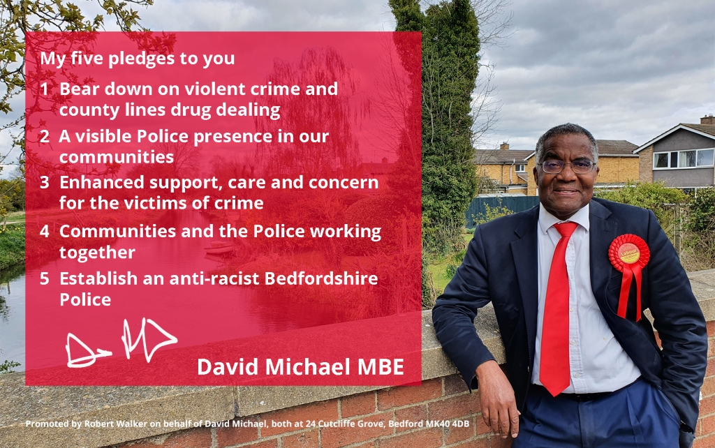 It is polling day today and an excellent chance to have a Labour voice representing Bedfordshire. I have got to know David over the last few months and, apart from being a good listener, a rare quality in a politician, he will bring the knowledge of 30 years of front line Police experience to the role. David has a track record of speaking out against injustice, and speaking up for what is right.